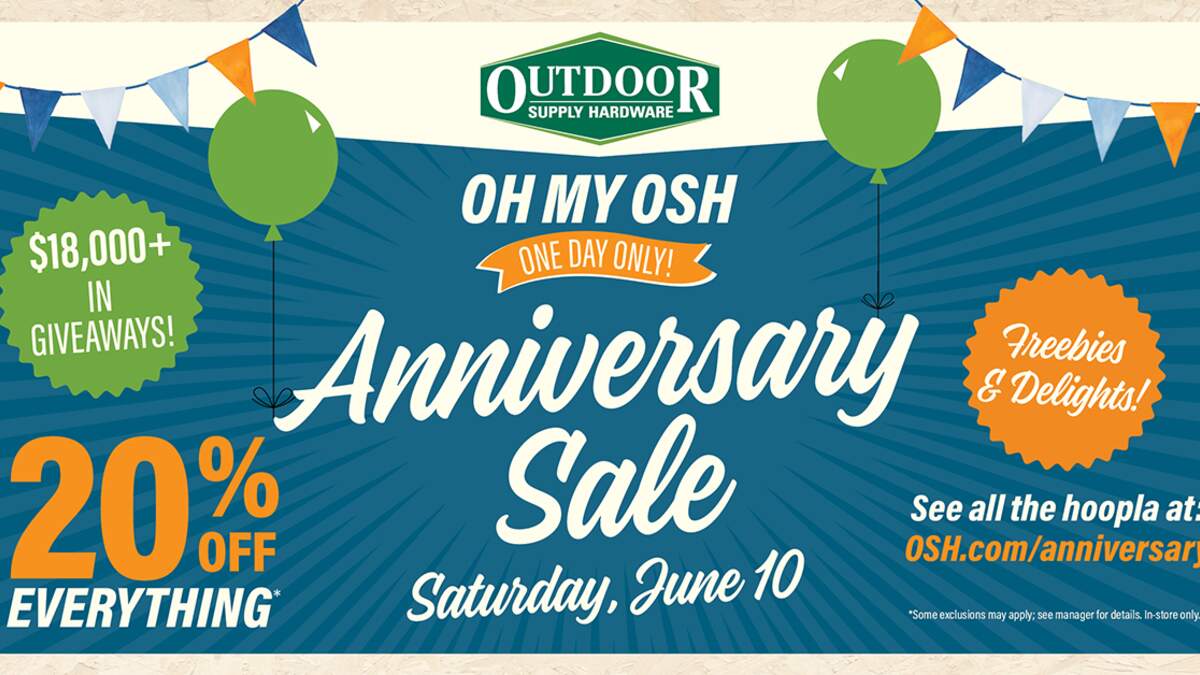 SAVE THE DATE: Let’s celebrate! You’re invited to the Outdoor Supply Hardware Anniversary Sale on Saturday, June 10, at all 14 stores. This one-day event is your chance to save 20% off (nearly) everything